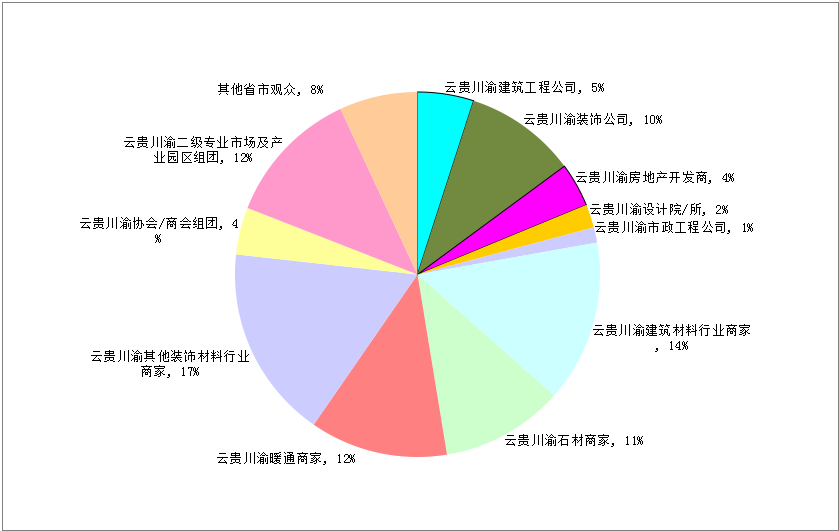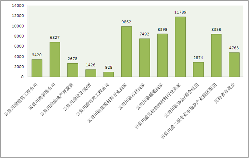 为期三天的精彩行业盛会,吸引了来自四川、重庆、云南、贵州、西安等省市建筑工程公司3420人,装饰公司6827人,房地产开发商2678人、设计院/所1726人,市政工程公司928人,建筑材料行业商家9862人,石材商家7492人,暖通商家8398人,其他装饰材料行业商家11789人,协会/商会组团2874人,二级专业市场及产业园区组团8358人,其他省市观众4763人,本届建博会共吸引了69115名专业人士到场参观洽谈合作,现场直接和间接成交额突破6亿元。上千品牌厂商云集、观众人气爆棚、同期精彩活动亮点纷呈,使成都建博会享誉“中西部建材行业第一展“